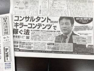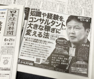 7月3日、日本経済新聞本紙第3面に、当社代表五藤の著書『あなたの知識や経験を、コンサルタントになって大きな稼ぎに変える法』が、出版元のエベレスト出版より広告掲載されまし...