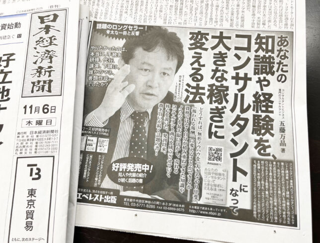 11月6日、日本経済新聞本紙第3面に、当社代表五藤のロングセラー著『あなたの知識や経験を、コンサルタントになって大きな稼ぎに変える法』が、他の書籍と共に出版元のエベレスト出版より広告掲載されました。五藤の本は併せて他のシリーズ書も告知されています。まだお読みになられていない方は、ぜひお手に取っていただければと存じます。(青山)
