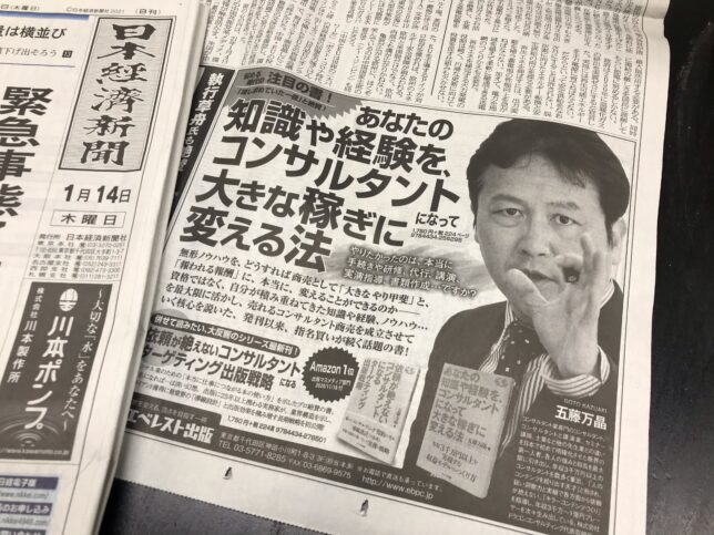 1月14日、弊社代表 五藤の書、『あなたの知識や経験を、コンサルタントになって大きな稼ぎに変える法』ならびに『依頼が絶えないコンサルタントになるターゲティング出版戦略』が、エベレスト出版により、日本経済新聞に掲載されました!。ありがとうございます! (青山)